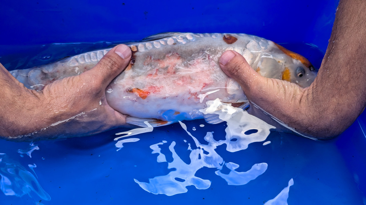 Every 5-6 days I was bowling her and covering her entire body (behind the gills) in Tamodine. This had to be done without sedate as the pond water is still salted from the Costia treatment.