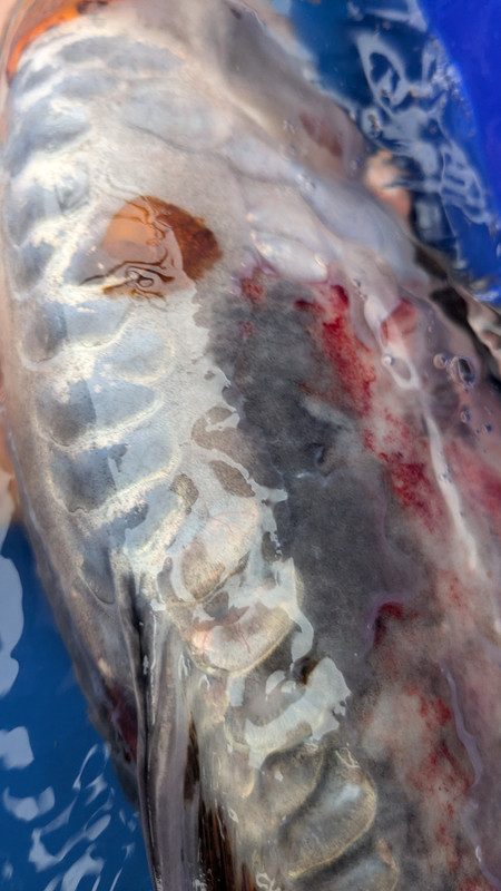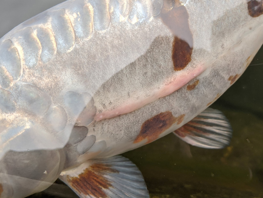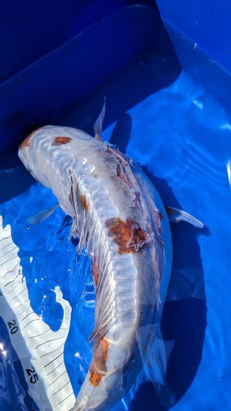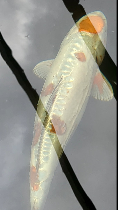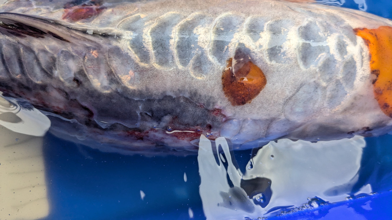 In August into September 2023 I had white spot immediately followed by a major fluke outbreak following the purchase of a new Koi. All Koi were flashing like crazy and the Ochiba was no exception, with her flanks being a little pink. After multiple pond treatments to eradicate the critters all the Koi healed up well, but the Ochiba still looked a bit dodgy with mucus strings, swollen lateral line and what looked like raised streaks of skin. This photo was taken in October 2023: