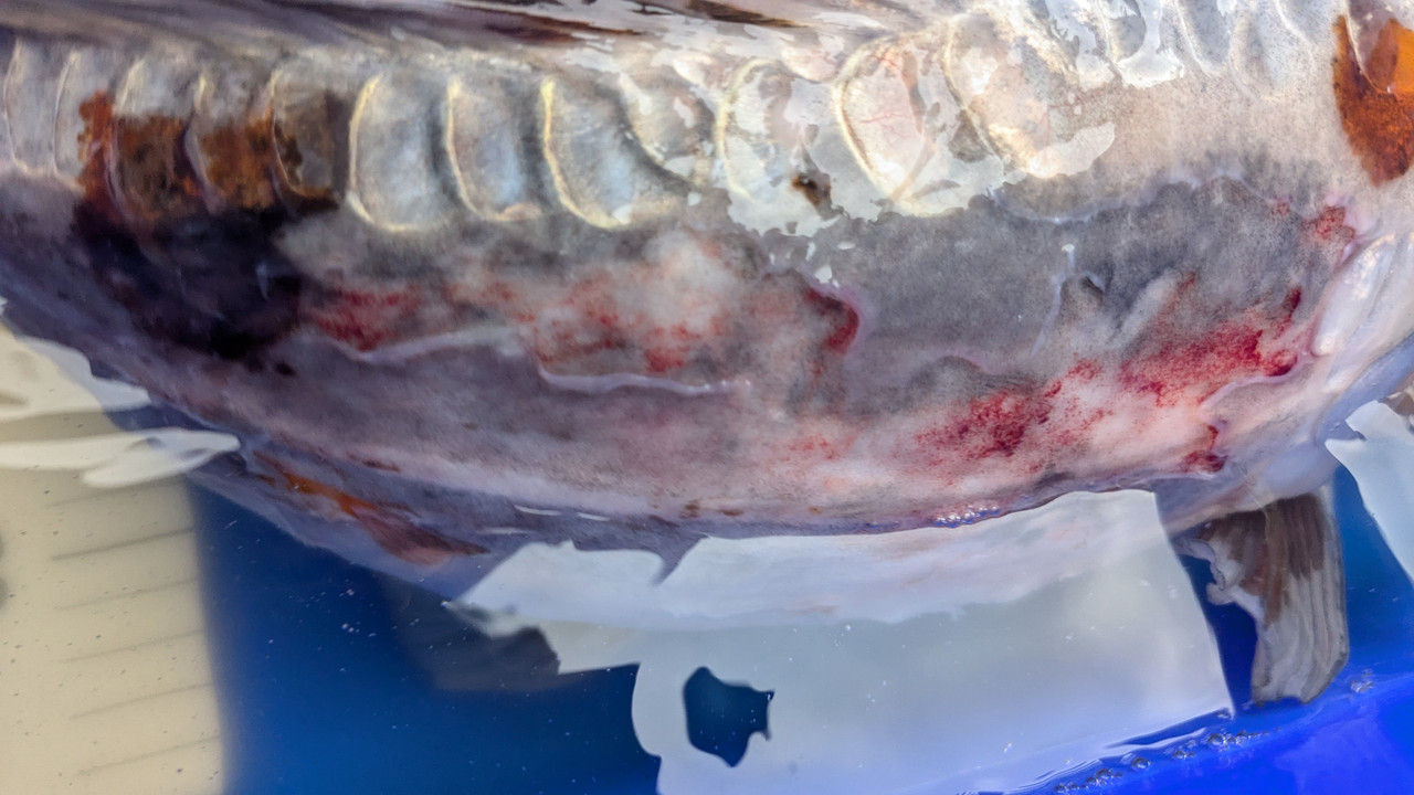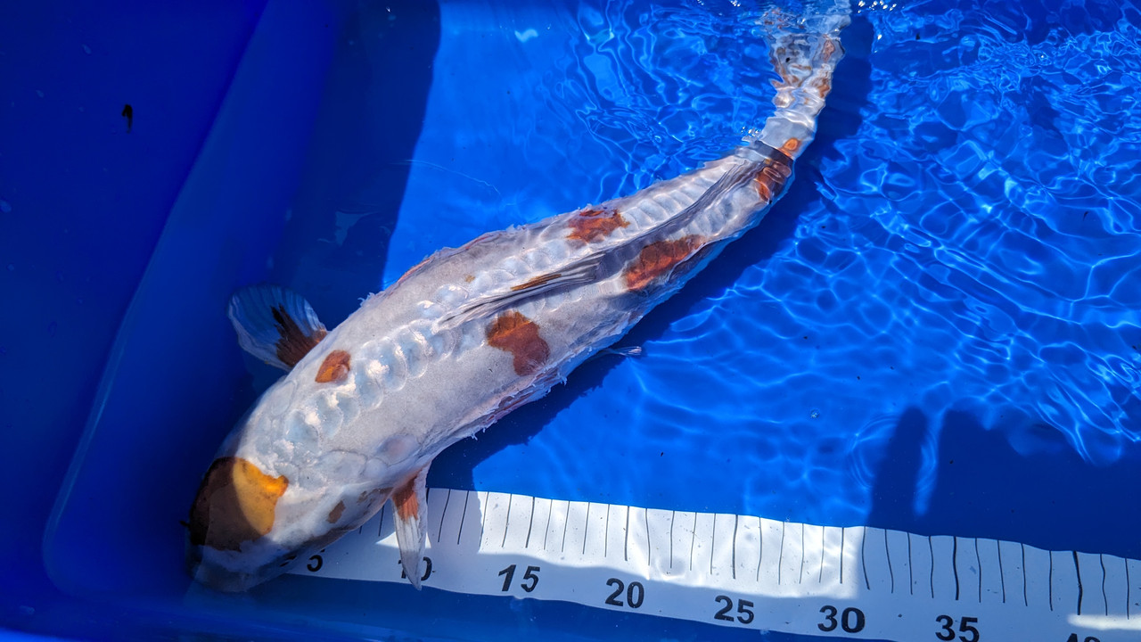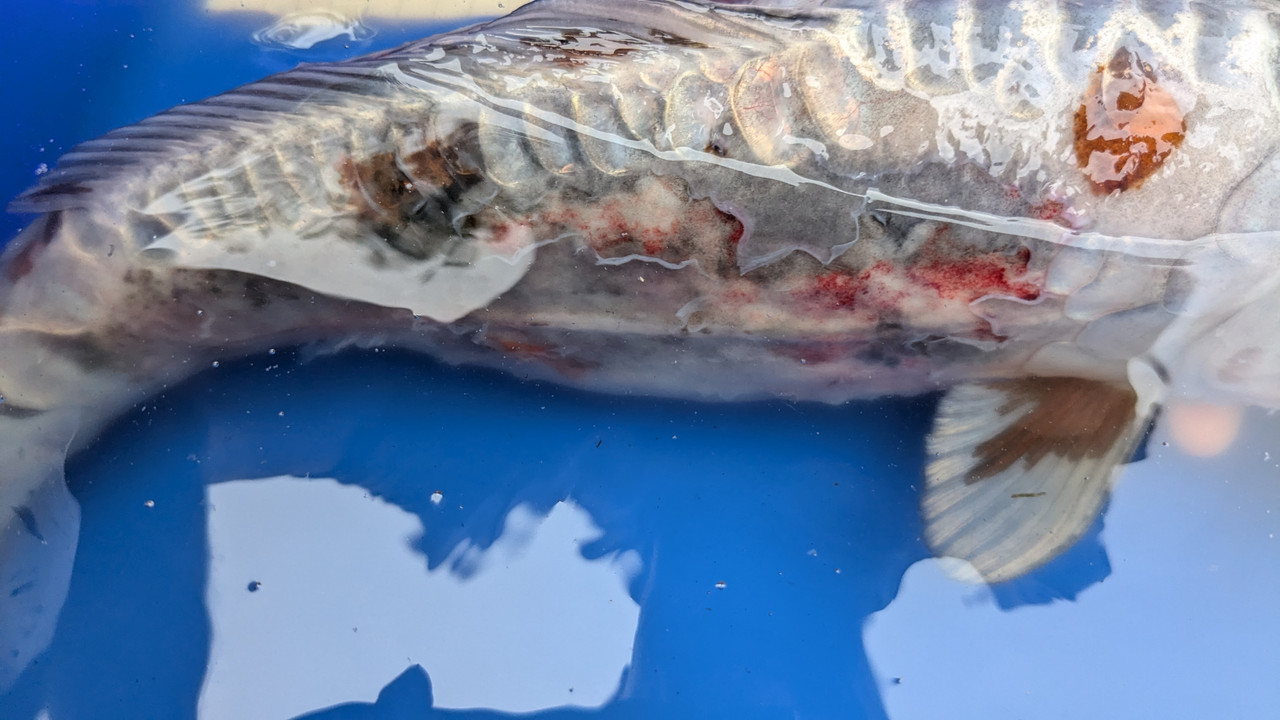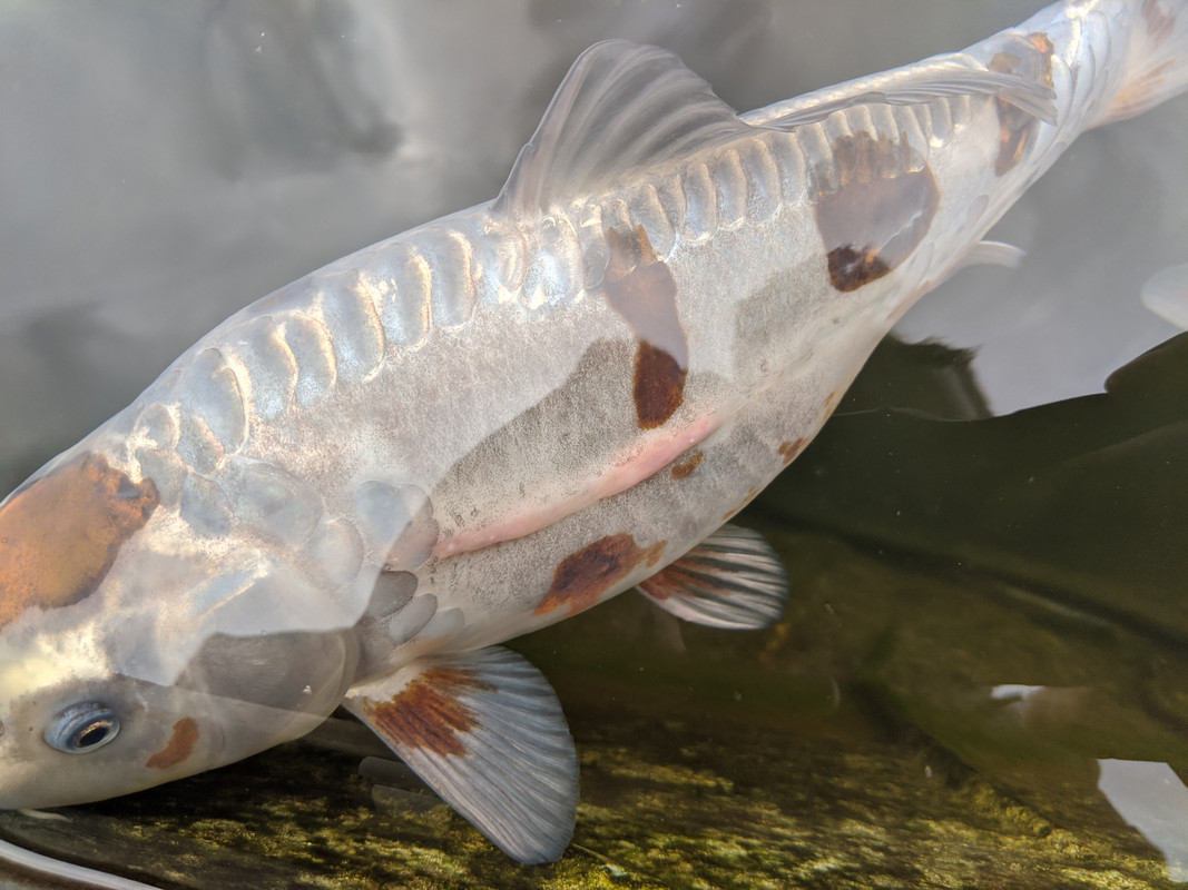 In August into September 2023 I had white spot immediately followed by a major fluke outbreak following the purchase of a new Koi. All Koi were flashing like crazy and the Ochiba was no exception, with her flanks being a little pink. After multiple pond treatments to eradicate the critters all the Koi healed up well, but the Ochiba still looked a bit dodgy with mucus strings, swollen lateral line and what looked like raised streaks of skin. This photo was taken in October 2023: