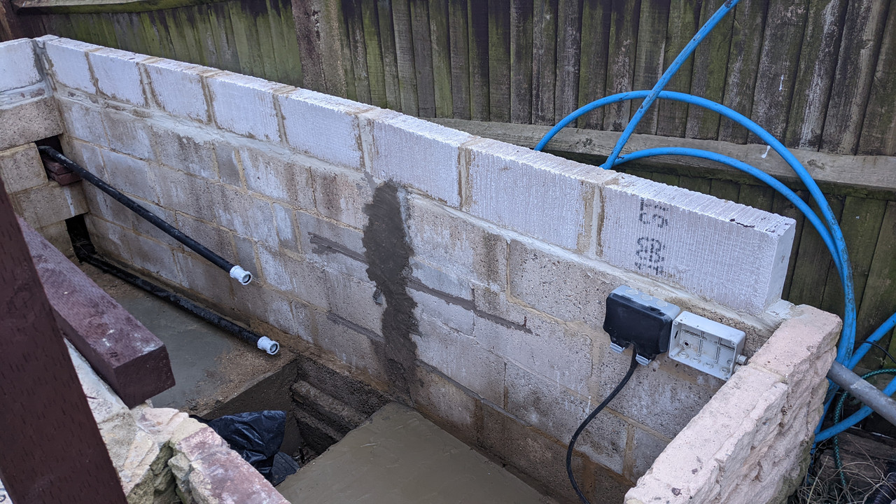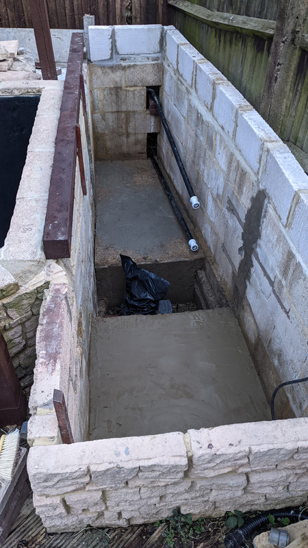 On the right is the filter pit wall, on the left is the corner of the pond: