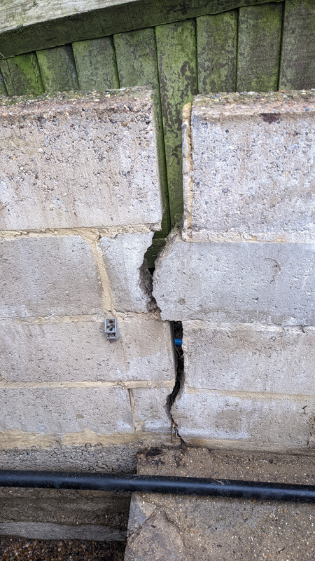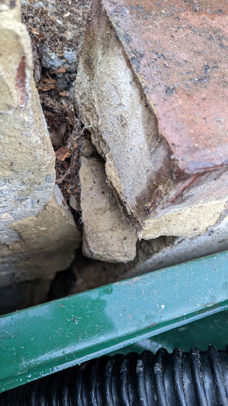 The opposite side of the filter pit to the pond, the right half of the filter pit has sunk and the left half has started sliding down the bank at the end of my garden: